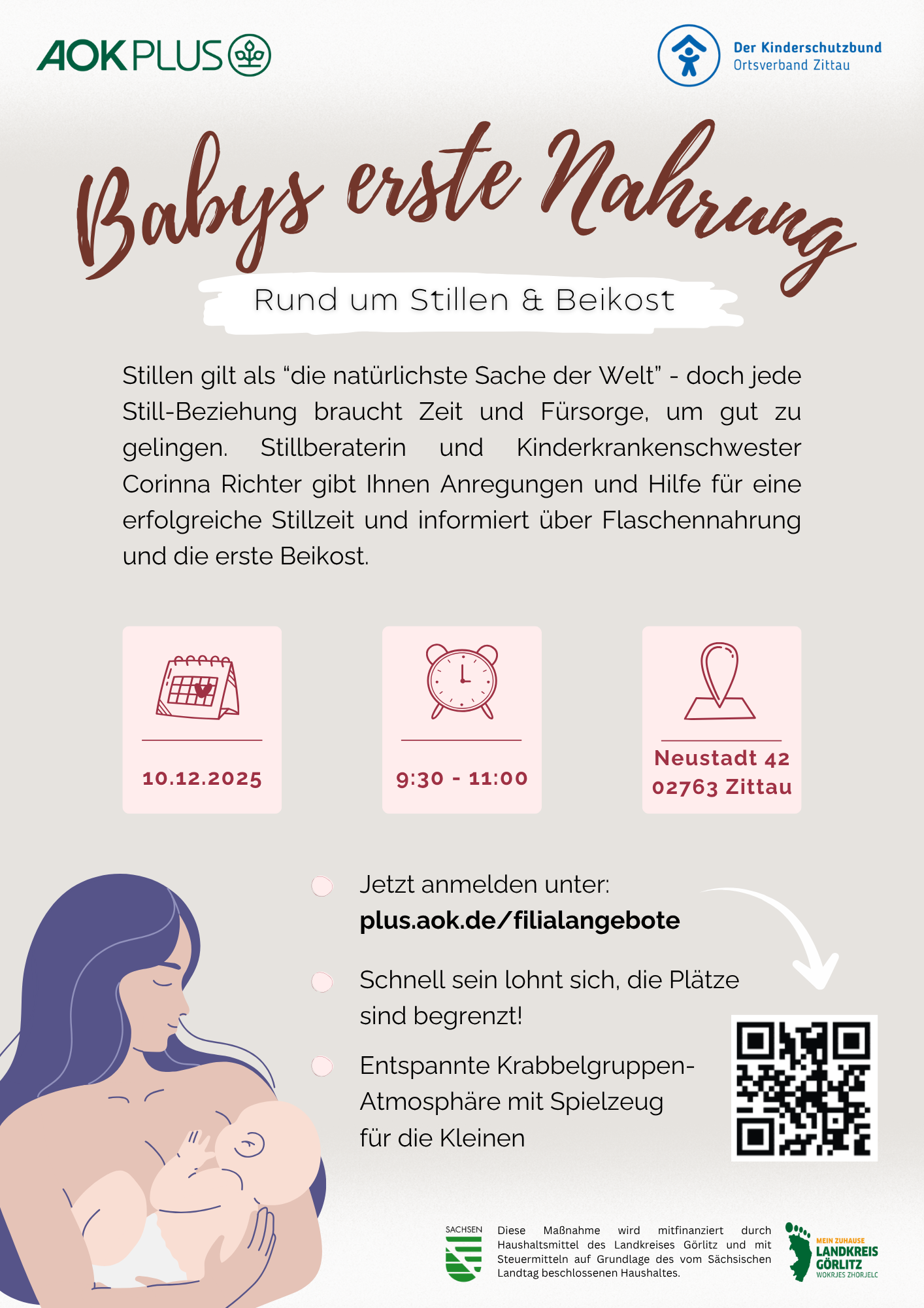Eltern aufgepasst! Am 10.12. findet in Kooperation mit der AOK PLUS Zittau eine tolle Veranstaltung mit Stillberaterin Corinna Richter in unseren Räumen auf der Neustadt 42 statt.🌿🧸